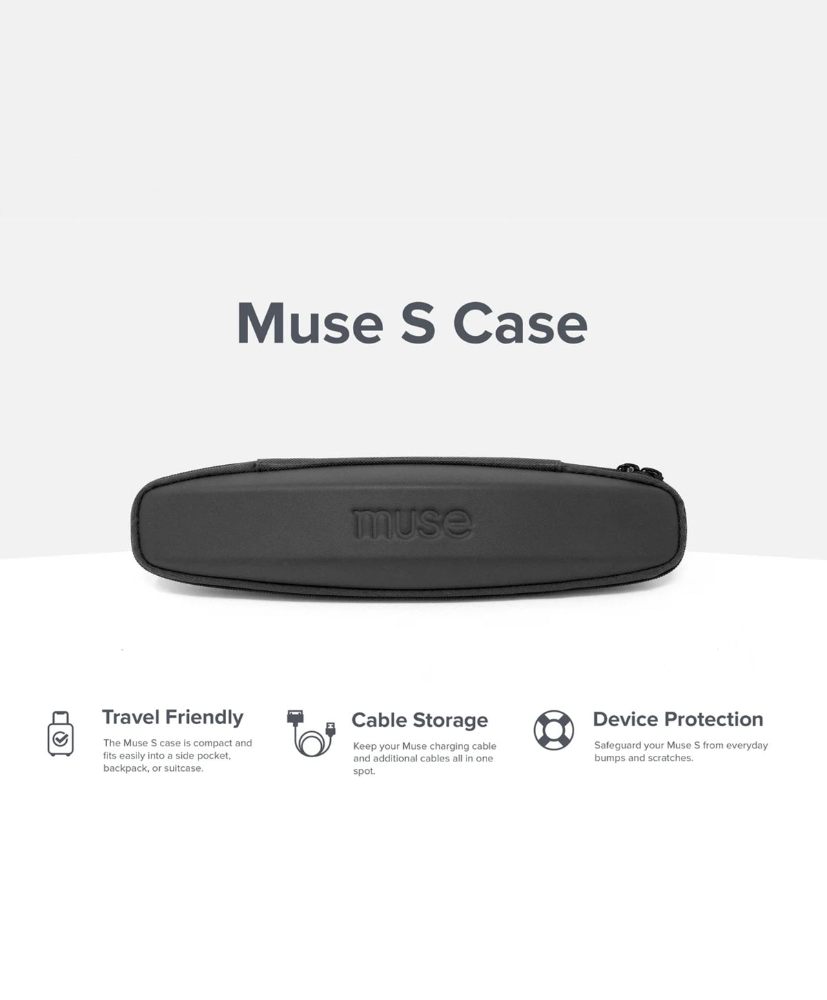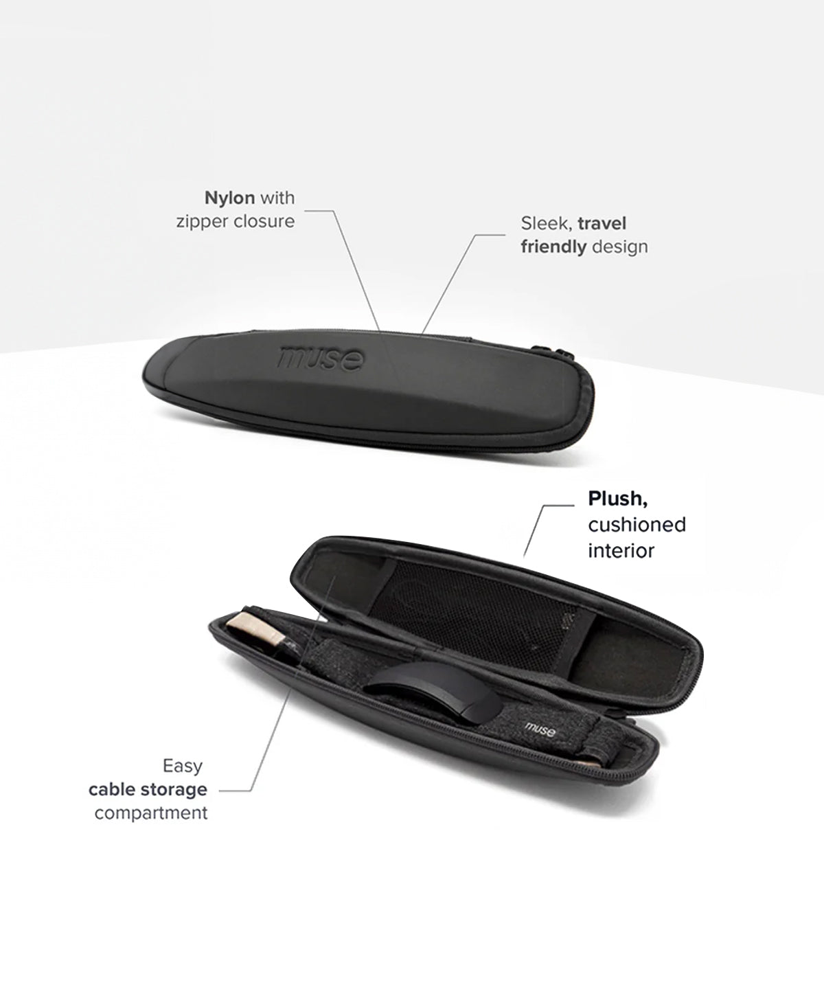 The Official Muse S: The Brain Sensing Headband Storage & Travel Case makes it easy to safeguard your new headset from everyday bumps and scratches and the divider sleeve straps help keep your cables organized