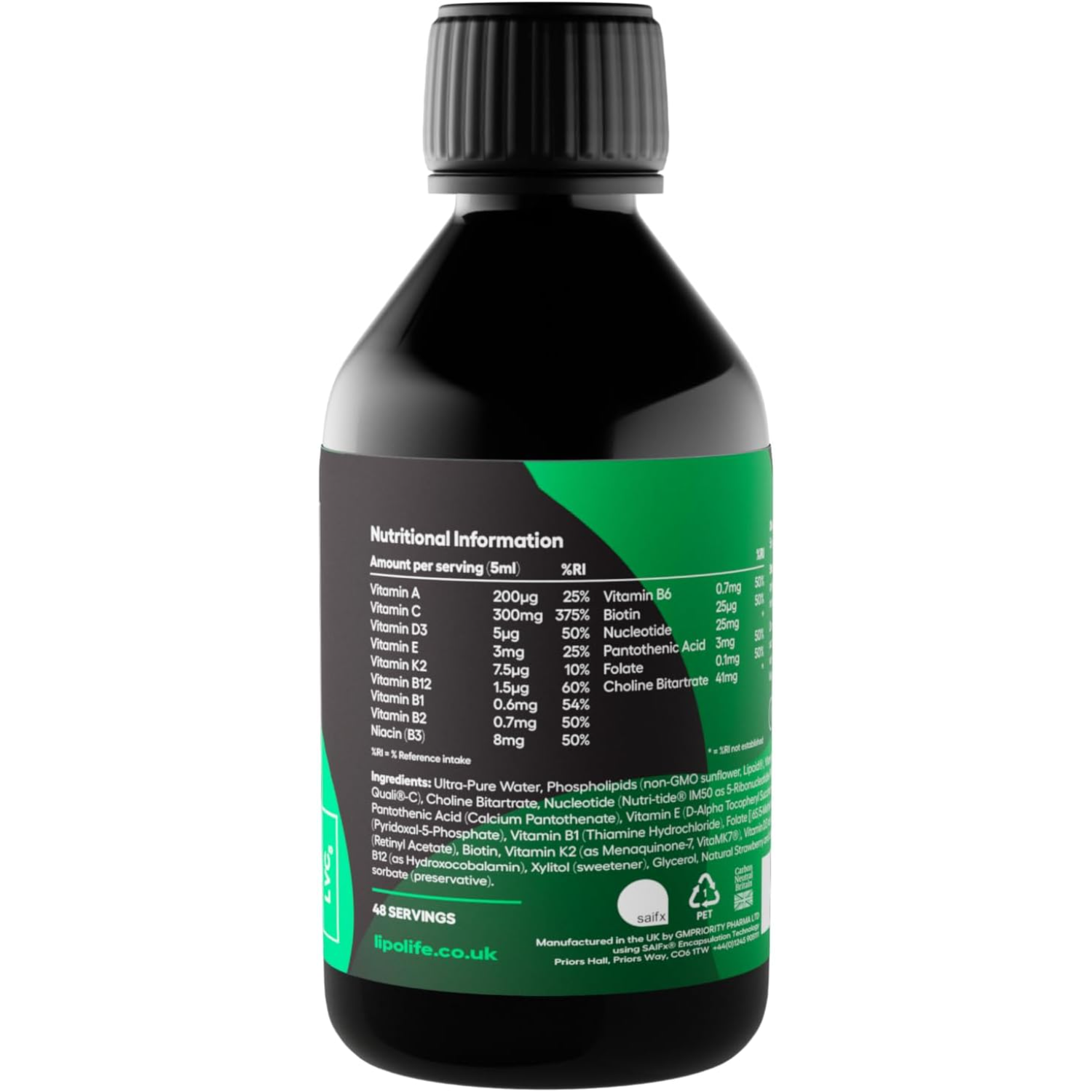 - PREMIUM SUPPLEMENTS MADE IN THE UK – We don’t use third-party contract manufacturers. Ever. Lipolife VEGAN LIPOSOMAL LIQUID MULTIVITAMIN SUPPLEMENT is made in the UK to cGMP standards in an FSSC accredited facility.