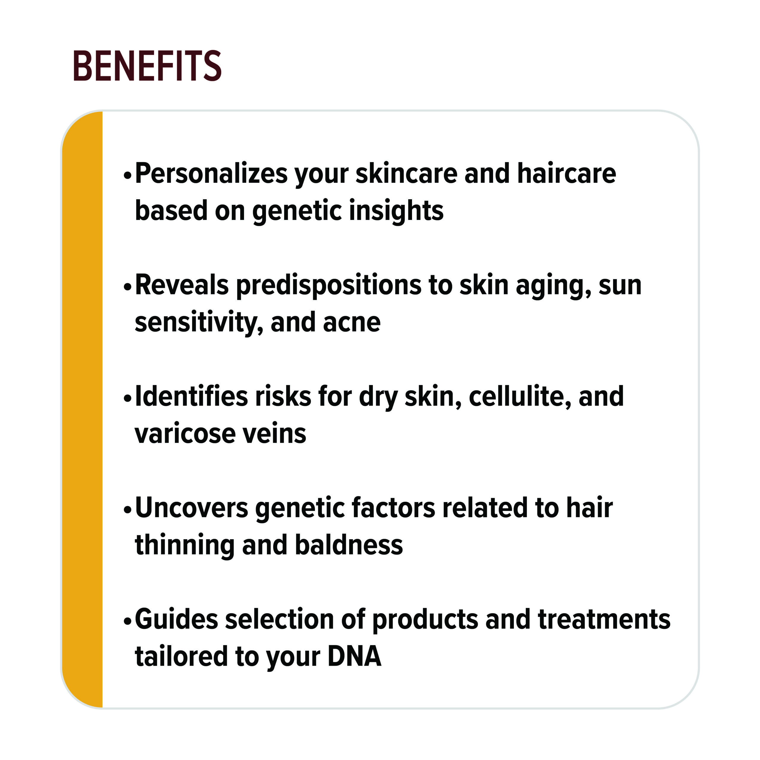Reveals predispositions to skin aging, sun sensitivity, and acne