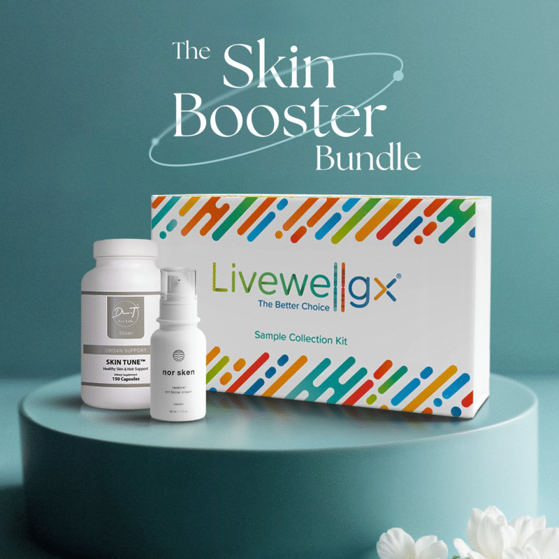 This bundle begins with a personalized Skinwellgx™️ DNA hair and skin report, revealing the exact genetic factors influencing your skin health, pigmentation, elasticity, collagen breakdown, and hair strength. Followed by the powerful and doctor-made forumla of SKINTUNE™️ by Dr.T For Life™️, far from your average hair and nail supplement and intensely more efftective. Completed with the soothing and clinically proven reverse-aging glow from the Nor Sken™️ range, the bundle is science-backed and designed to heal your skin barrier, reverse signs of aging and give you data-driven insights that can help build your skin and hair routine in a way that actually works.